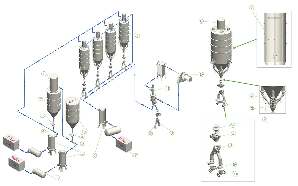 The pneumatic conveying system uses compressed gas as the transport medium to move dry powders, granules, or small bulk-solids through a sealed pipeline. This enclosed method ensures clean, dust-free material transfer while minimizing energy consumption and eliminating leakage. Tailored to specific material properties such as bulk density and flowability, the conveying system allows for customized pipeline configurations and power setups, making it suitable for complex industrial environments and demanding processing conditions.