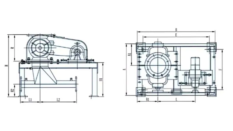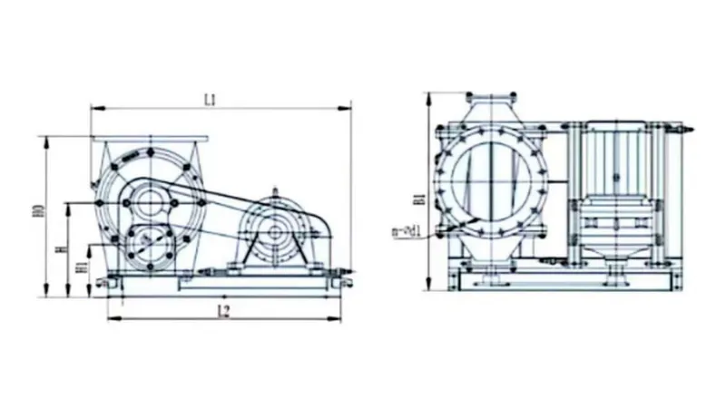 | Model | Drive Motor (kW) | Rotor Capacity (L/rev) | L1 | L2 | B1 | H0 | n-Ød1 | H | H1 | ØK | Weight (kg) |